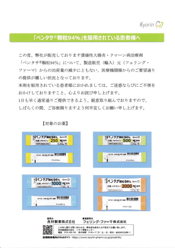 「ペンタサ®️顆粒94%」の出荷制限について
