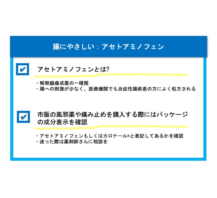 アセトアミノフェンは、腸の粘膜を刺激しにくく、腸にやさしい解熱鎮痛薬として知られています。医療機関でも、炎症性腸疾患の方に使われることが多いお薬です。アセトアミノフェンはカロナール®️という名前で表示されていることもあります。