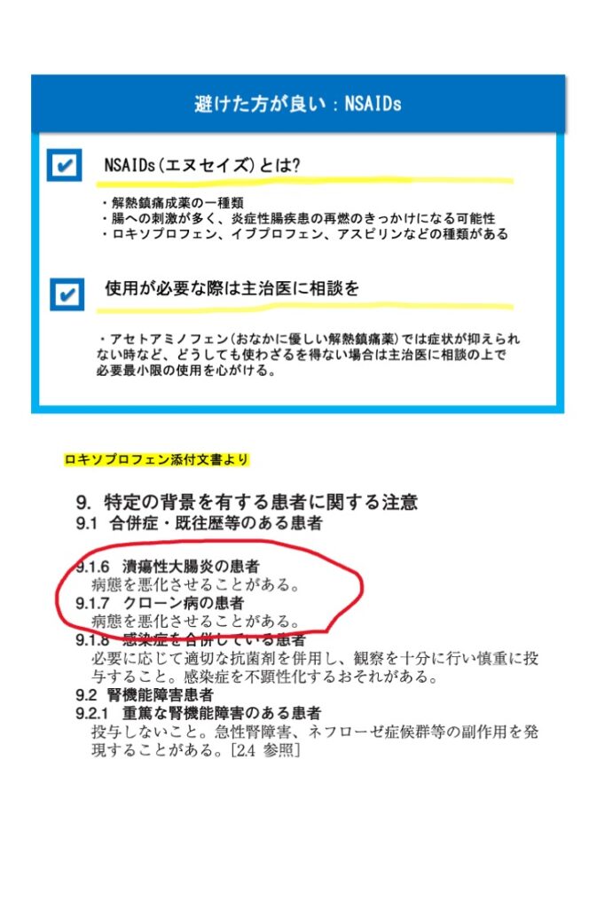 NSAIDsは炎症や痛みを抑える効果が高い一方で、腸の粘膜を傷つけやすいという特徴があります。そのため、潰瘍性大腸炎やクローン病の方では、再燃のきっかけになる可能性が指摘されています。特に、腹痛や下痢、血便が出やすくなることがあり、注意が必要です。