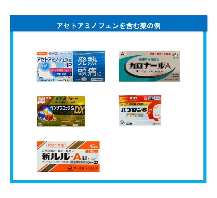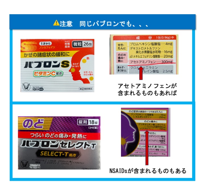 市販の風邪薬や痛み止めには、いくつかの成分が一緒に入っていることがあります。購入するときは、薬のパッケージや成分表示をよく確認し、「アセトアミノフェン(カロナール®️)」が含まれているかを見ることが大切です。たとえ薬の名前が一緒でも〇〇SにはNSAIDsが含まれ、〇〇Aにはアセトアミノフェンが含まれている、なんてこともあるため注意が必要です。どれを選べばよいか迷ったときは、薬剤師さんに相談してから購入すると安心です。